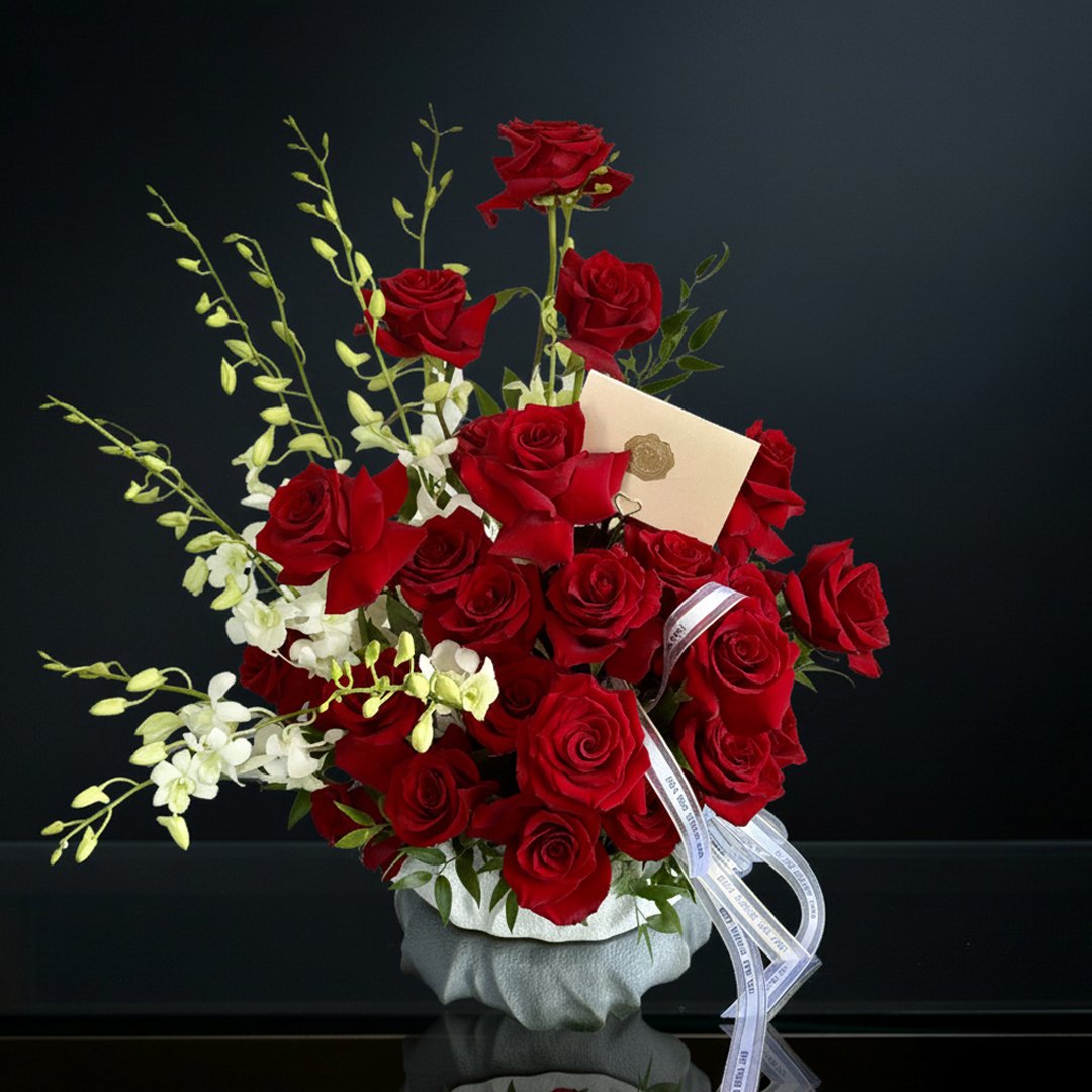 Vibrant red roses that awaken emotions and symbolize the intensity of true love. This floral arrangement combines the strength of roses with the delicacy of white orchids, creating a sophisticated composition that ignites passion and celebrates the deepest, most enduring love stories.